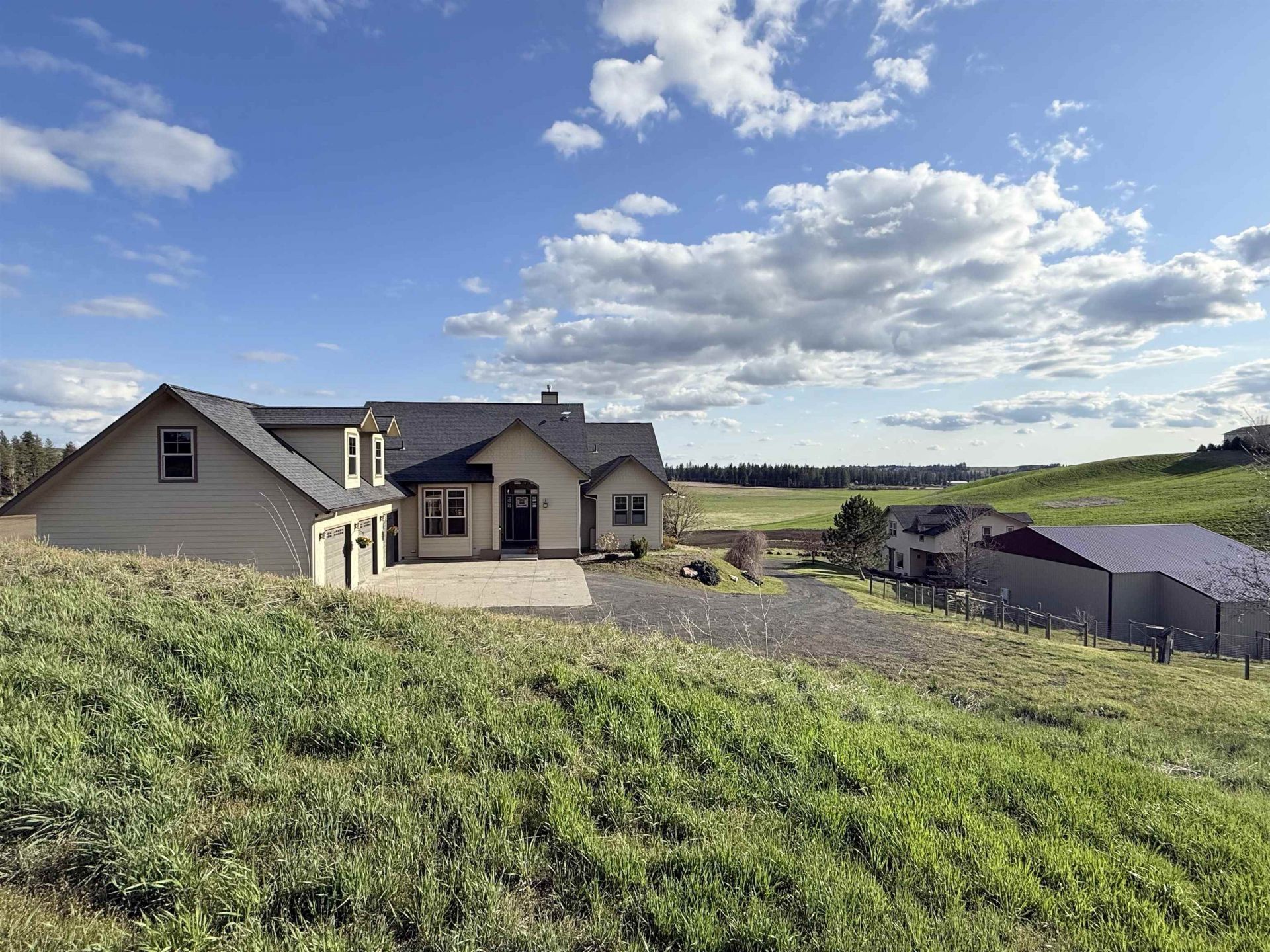 Take in the sweeping territorial views of rolling fields stretching to Steptoe Butte from your covered deck, and every room. This well maintained custom home showcases superior quality and energy efficient geothermal heating. Ideal for multi-generational living with a detached ADU plus additional basement quarters featuring a kitchenette. The main home offers cherry floors, quality cabinetry, granite surfaces, great room with fireplace, 4 bedrooms, bonus room, sunroom, and a spacious basement with family room. The large primary suite includes dual sinks, two closets, soaking tub & mud-set shower. The ADU features 2 bedrooms, 2 bathrooms, living room with fireplace, room to expand, and garage. Potentially rent out the ADU home for added income. A 48x60 shop or barn includes a tool room & loft. Located off a paved road just minutes to Cheney and Spokane amenities.
